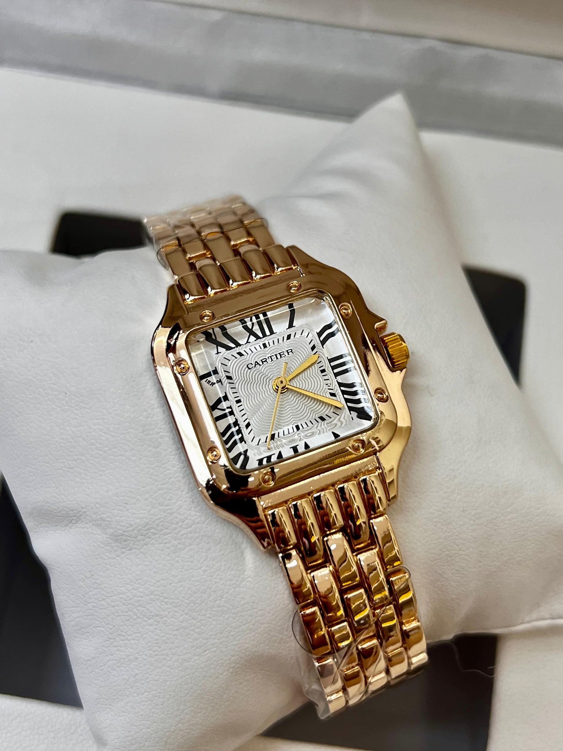 Cartier Panther: Es un diseño clásico inspirado en la alta relojería, acabados dorados que reflejan elegancia desde cualquier ángulo.