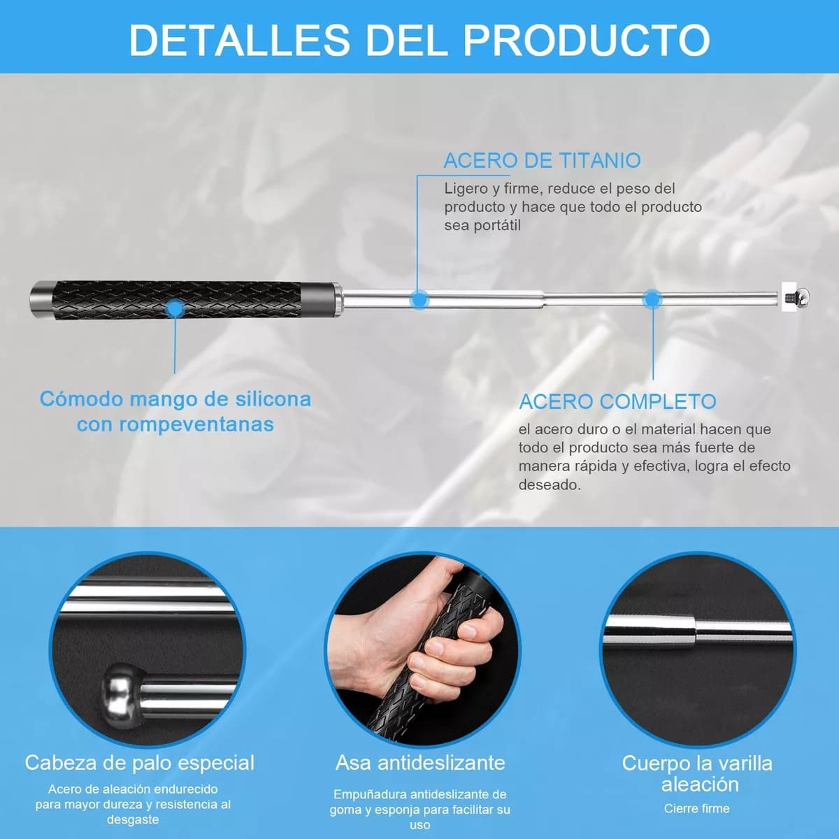 🔹 Apertura con un solo impulso hacia el frente sale la barra de acero, regresarla basta golpear en cualquier superficie sólida para que se oculte.